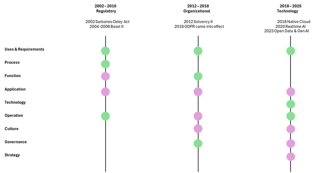 2012–2018 (Organizational): Solvency II (2012) and the GDPR (2016/2018) made the shift organizational. Functions (CDO, DPO) and Governance were impacted first. Through diffusion, the transformation spread to Culture (awareness programs), Applications (business/IT co-construction), Operations (shared supervision), and Strategy, where data began to be treated as an asset.