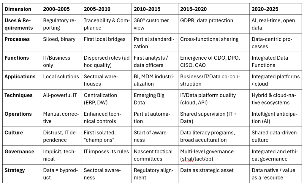 Longitudinal analysis shows a transformation pace that gradually intensified. The 2000-2010 periods were reactive and fragmented: constrained regulatory reporting, point-to-point technical fixes, uncoordinated roles. Acceleration became notable from 2010-2015, turning proactive with process standardization and BI industrialization. The 2015-2020 period confirmed this trend with multi-level governance and explicit data strategies. Finally, 2020-2025 culminates in systemic maturity, with all dimensions converging toward integration.