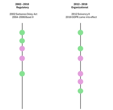 2002–2010 (Regulatory): The Sarbanes-Oxley Act (2002) and Basel II (2004–2006) imposed new traceability and consolidation rules. The initial impact hit Uses & Requirements, Processes, and Operations. The pressure then spread to Applications (data warehouses, consolidated reporting) and Functions (quality controllers, first specialized roles).