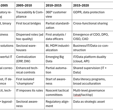 In the early 2000s, there was literally no dedicated strategic planning for data. This absence reflected reality: data was perceived as a means, never an end. It appeared in strategic plans only as support for business objectives, never as an autonomous strategic axis. Data budgets were buried within IT or business lines, lacking specific visibility or management.